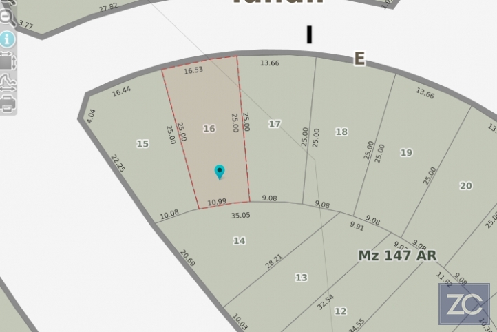 Cuenta con una superficie total de 344 m², con frente de 16,53 m y un largo de 25 m, de forma irregular.