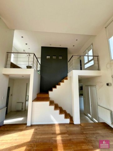 Living de doble altura, cocina comedor separada