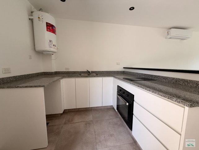 -Amplio living-comedor con cocina integrada, con barra desayunadora, aire acondicionado y salida a patio verde.