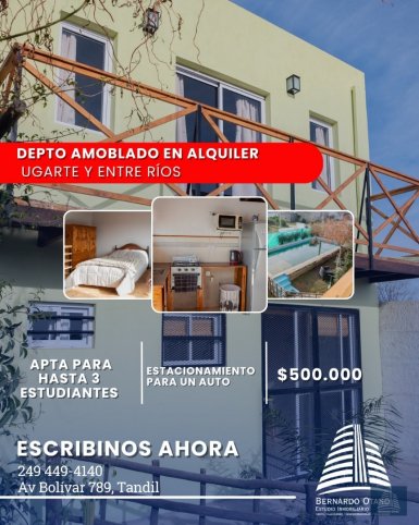 ¡Ingreso alquiler ideal para estudiantes! Departamento amoblado en Ugarte y Entre Ríos El colectivo azul pasa por la esquina y te lleva directo al campus universitario. Apta para hasta 3 estudiantes. No se aceptan mascotas.