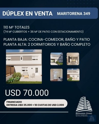 NUEVOS INGRESOS ¡AL POZO! ? Dúplex de 2 Dormitorios en Tandil ? Maritorena 349 Moderno y amplio, con 110 m² totales (74 m² cubiertos + 36 m² de patio con estacionamiento). ? Planta baja: cocina-comedor, baño y patio ? Planta alta
