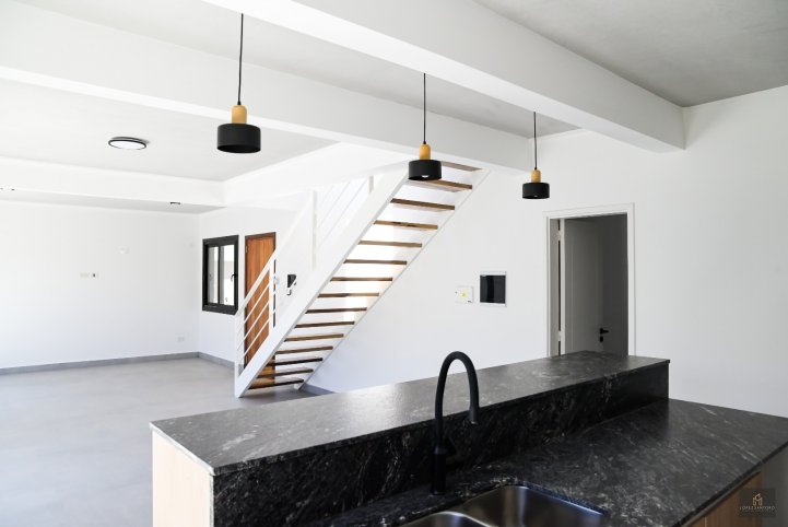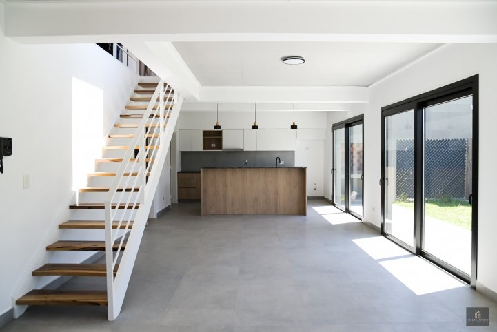 En planta baja, un amplio living comedor se integra naturalmente al jardín a través de grandes ventanales, generando una sensación de continuidad y luminosidad. La cocina moderna y funcional, se destaca por sus muebles de diseño, amplias mesadas, barra e isla, pensadas tanto para el uso diario como para compartir. Completa esta planta un toilette, lavadero independiente con espacio de guardado, patio con parrilla y estacionamiento propio.